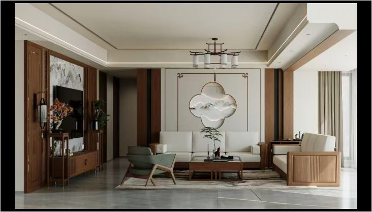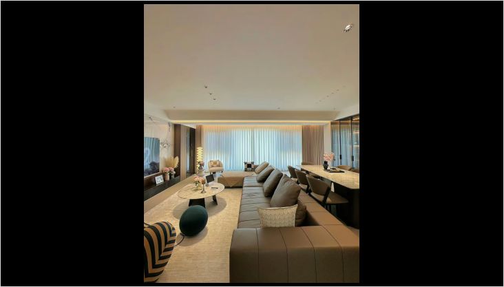 简约的装饰画为墙面增添艺术氛围,抽象的画作让人充满遐想。黑色的边柜上摆放着精致的摆件和书籍,彰显主人的品味。再加上一盏球形落地灯,柔和的灯光让夜晚的客厅更加温馨。