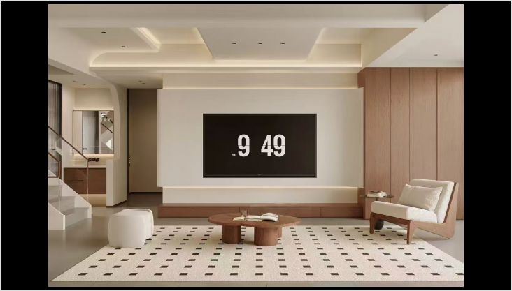 整体以暖色调为主,浅米色的墙面搭配木质地板,营造出自然、舒适的氛围。黑色的皮质沙发,质感十足,为空间增添了一份沉稳与大气。搭配几个不同花色和材质的抱枕,丰富了视觉层次,又带来柔软的触感。
