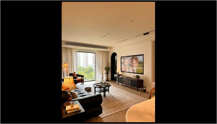 客厅深棕皮沙发+复古吊灯,雕花顶角线藏着旧时光浪漫,屏风一摆,东方韵味和西洋格调撞了个满怀~