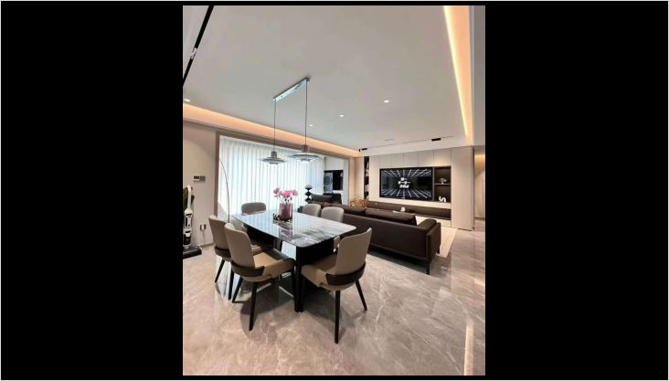 椭圆形的餐桌,柔和的边角设计,让整个空间显得更加灵动。搭配上不同款式却又风格统一的餐椅,既有个性又和谐。餐桌上方的三盏吊灯,简约大气,灯光洒下,营造出温馨又有格调的用餐氛围。无主灯设计搭配筒灯和隐藏灯带,让餐厅在晚上也能保持明亮且有层次感。