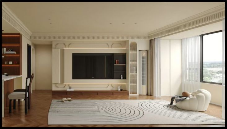 ✔️客厅:深棕+米白撞色,悬浮电视柜+嵌入式灯光,极简又显贵