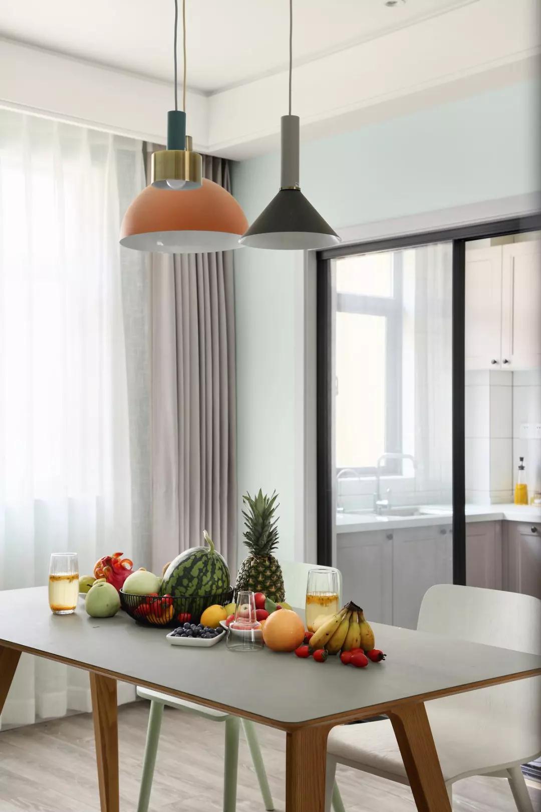 餐厅,薄荷绿的墙面以一幅温馨格调的挂画装点,原木餐桌加以薄荷绿桌面清新自然,同时以卡座+靠背椅充当餐椅,打造出浪漫又实用的就餐氛围。