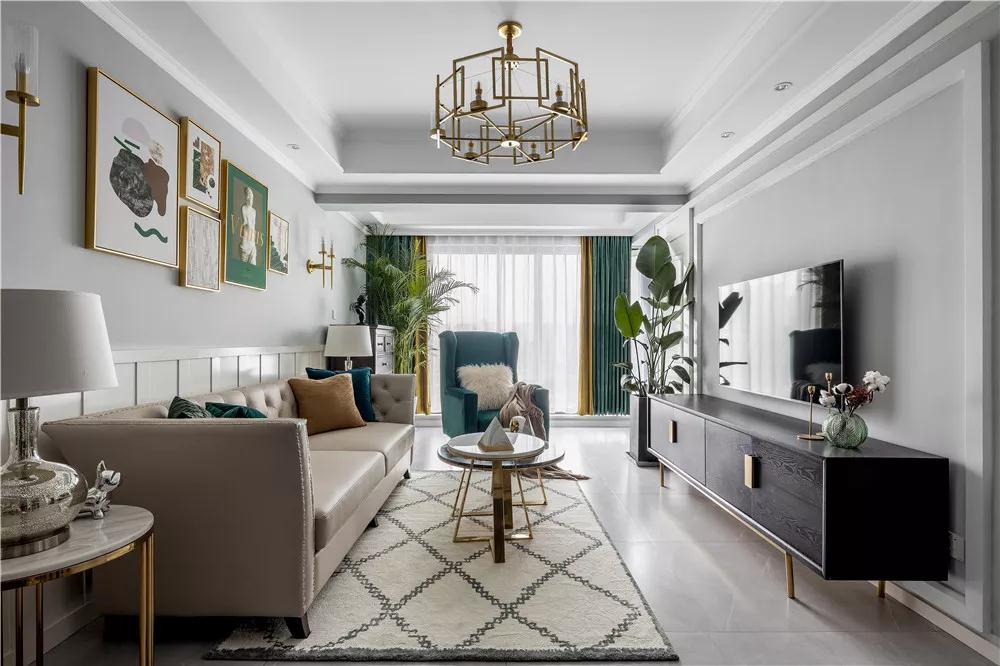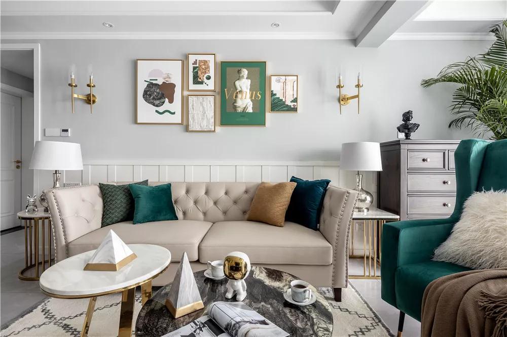 米白色皮质沙发充满质感,沙发背景墙以铜质壁灯与艺术挂画装点,展现出美式风格的奢华与典雅。