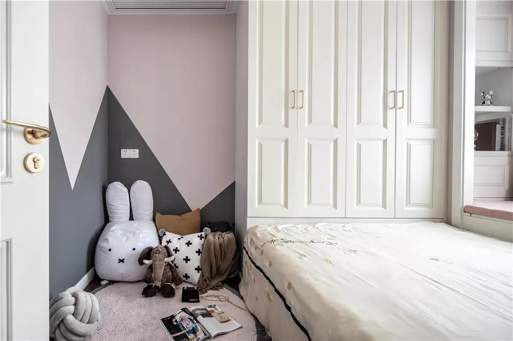 女儿房采用粉丁香色为主调,温馨而浪漫。墙面做了粉灰两色的拼色造型,粉色圆形小毯子柔软而舒适,摆放可爱的玩偶以及有趣的书籍,甜美而不失精致感。
