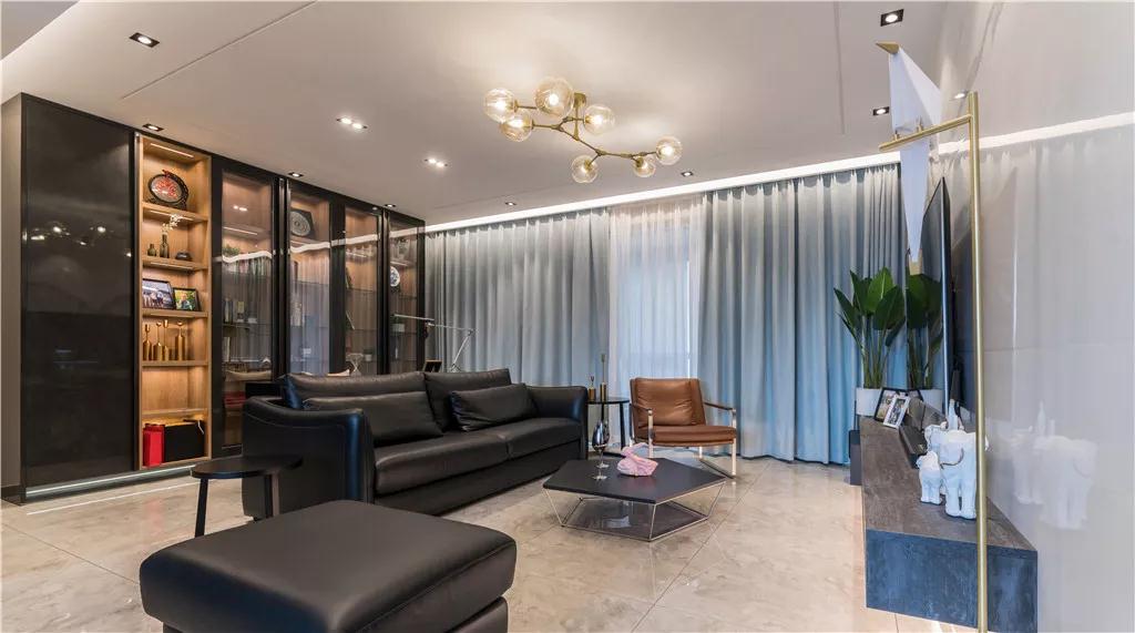 客厅与沙发后的书房打通,简洁利落的布置结合明快的黑白配色,让整个空间焕发出轻快活力的高档质感。