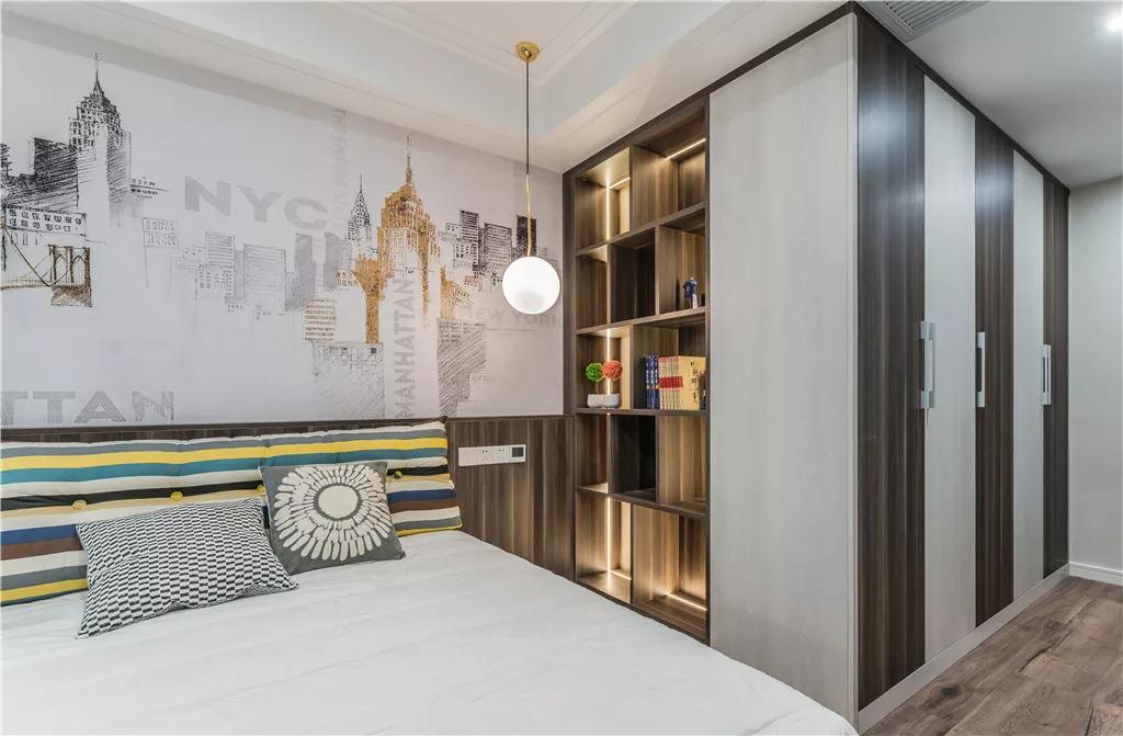 次卧进门的过道做了嵌入式的衣柜,床侧取消了床头柜并以壁龛柜收纳作为取代。
