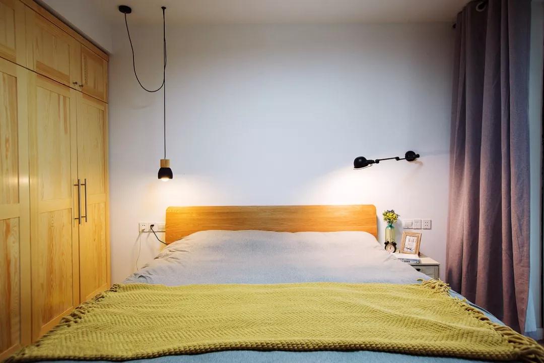 卧室没有过多的装饰,一边木质小吊灯、一边伸缩壁灯,躺在床上各有一片空间来做自己想做的事。