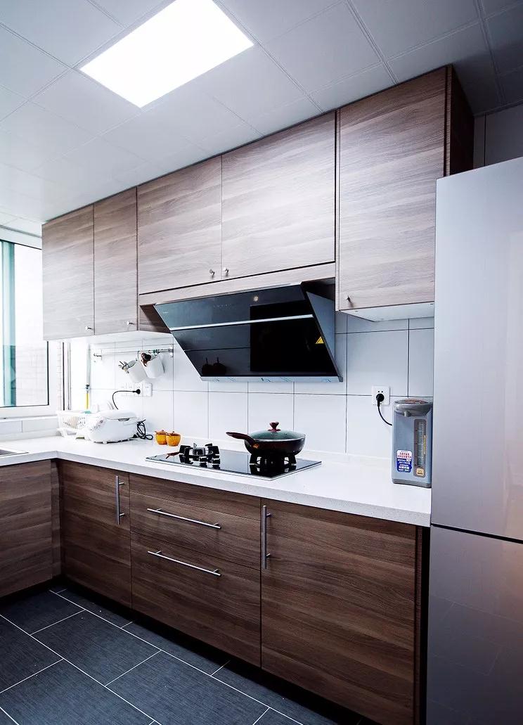 厨房,黑胡桃木色的橱柜,深灰色地砖搭配白色墙砖,整个厨房显得干净整洁。